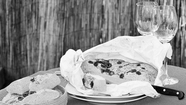Aus allen Zutaten einen Teig herstellen, die entkernten und klein geschnittenen Oliven und die fein gehackte Zwiebel zugeben.